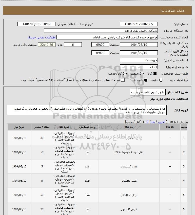 | 10 | -- | کیبورد | عدد | تجهیزات مخابراتی، کامپیوتر، موبایل، ملزومات جانبی و شبکه | 10 | 1404/08/10 |