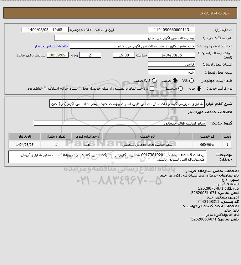 شرح کلی نیاز: شارژ و سرویس کپسولهای اتش نشانی طبق لسیت پیوست جهت بیمارستان نبی اکرم (ص) خنج