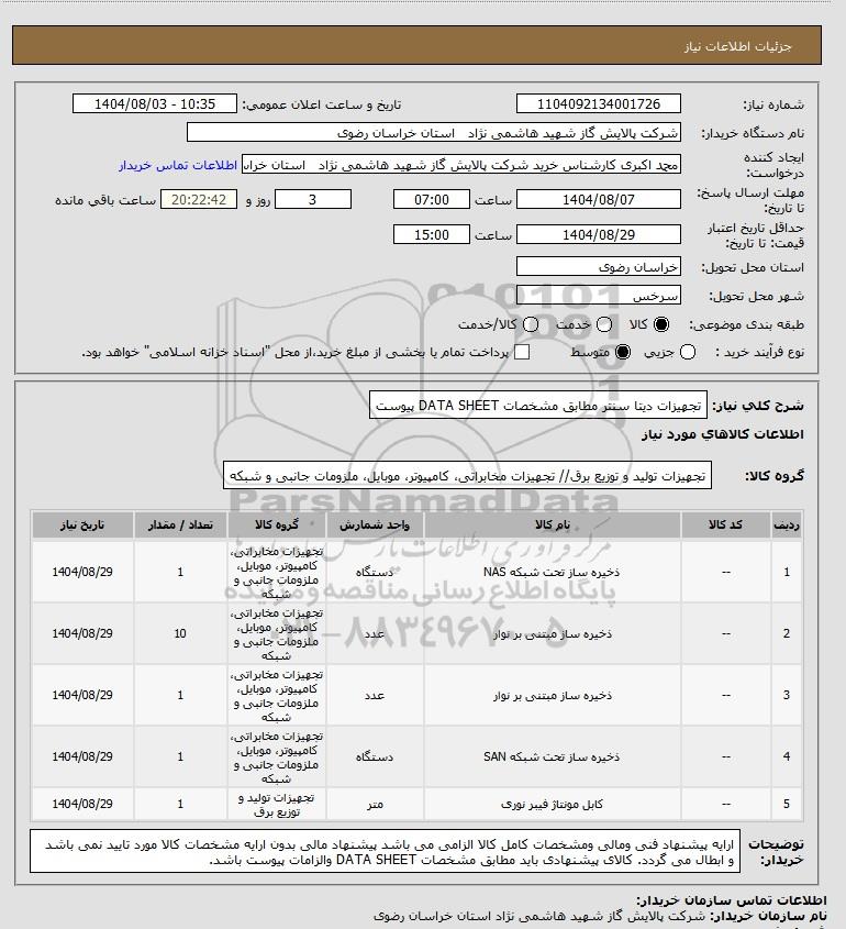 شرح کلی نیاز: تجهیزات دیتا سنتر مطابق مشخصات DATA SHEET پیوست