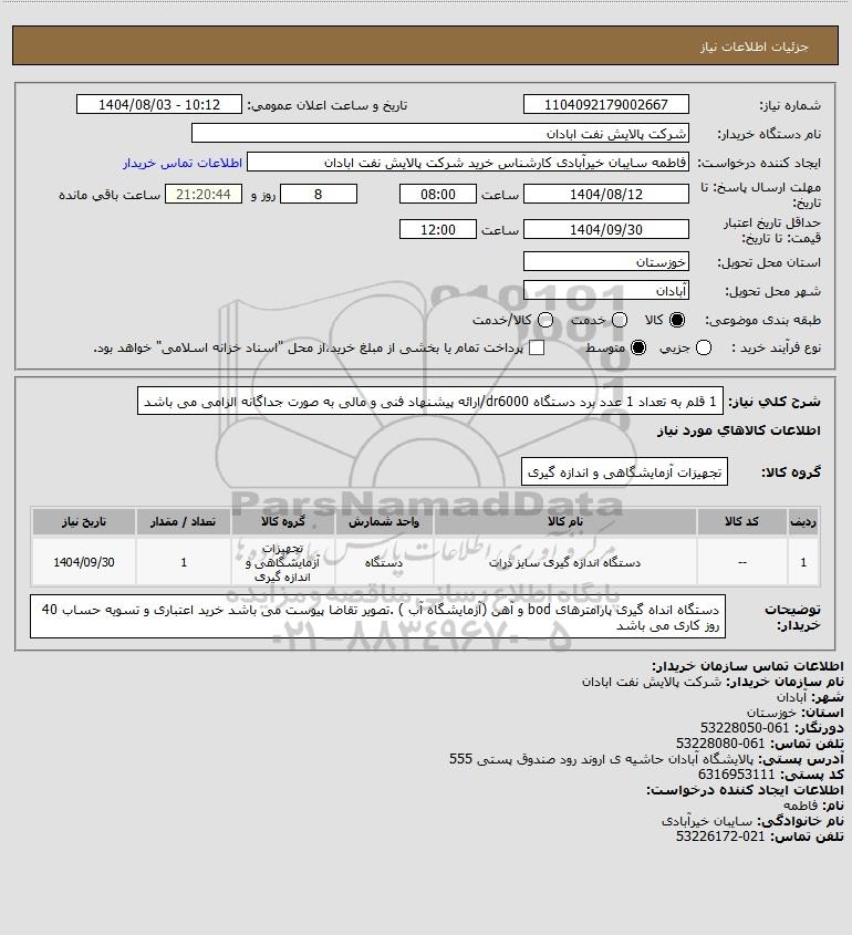 توضیحات خریدار:دستگاه انداه گیری پارامترهای bod و آهن (آزمایشگاه آب ) .تصویر تقاضا پیوست می باشد خرید اعتباری و تسویه حساب 40 روز کاری می باشد
