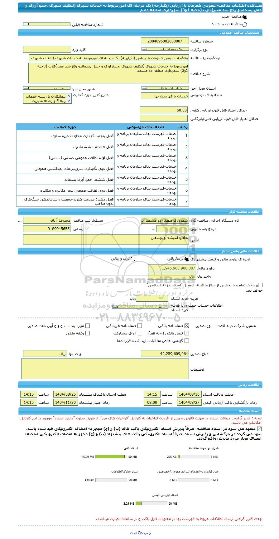 | شرح مناقصه | امورمربوط به خدمات شهری (تنظیف شهری ،جمع آوری و حمل پسماندو رفع سد معبر)فازب (ناحیه 1و3) شهرداری منطقه ده مشهد | ||||||||||||||||||||||||||