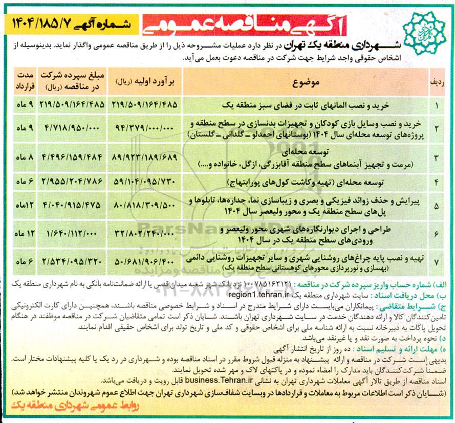 شهرداری منطقه یک تهران در نظر دارد عملیات مشروحه ذیل را از طریق مناقصه عمومی واگذار نماید. بدینوسیله از اشخاص حقوقی واجد شرایط جهت شرکت در مناقصه دعوت بعمل می آید.