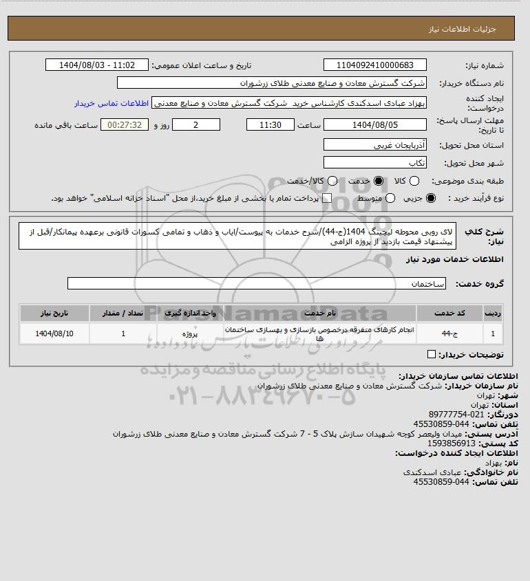 شرح کلی نیاز: لای روبی محوطه لیچینگ 1404(ج-44)/شرح خدمات به پیوست/ایاب و ذهاب و تمامی کسورات قانونی برعهده پیمانکار/قبل از پیشنهاد قیمت بازدید از پروژه الزامی