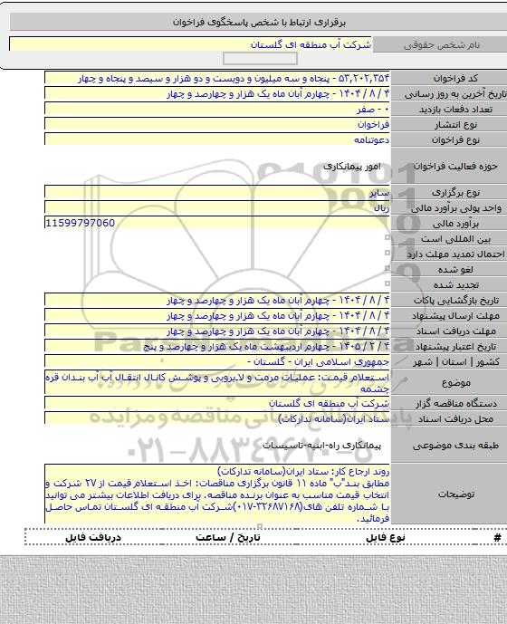 مناقصه استعلام قیمت: عملیات مرمت و لایروبی و پوشش کانال انتقال آب آب بندان قره چشمه از کلیه افراد متخصص و شرکتها واجد شرایط دعوت به عمل میآید در مناقصه با کد خبرگزاری پارس نماد: 9746419 شرکت نمایند.