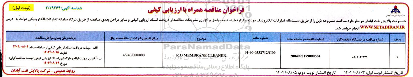 | 404/37/ک | 2004092179000584 | 01-90-0332712/G09 | R.O MEMBERANE CLEANER | 4.740.000.000 | الف- مهلت دریافت اسناد ارزیابی کیفی از سامانه ستاد از تاریخ 1404.8.4 لغایت 14048.15 ب- آخرین مهلت ارائه و بارگزاری اسناد ارزیابی کیفی توسط مناقصه گران مورخ 1404.8.29 |