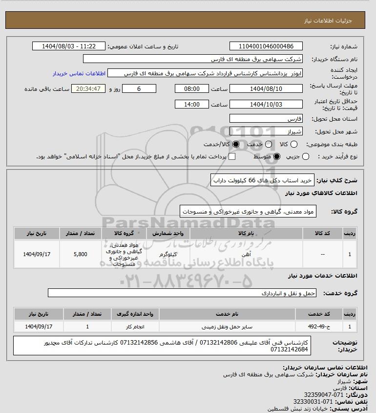 شرح کلی نیاز: خرید استاب دکل های 66 کیلوولت داراب