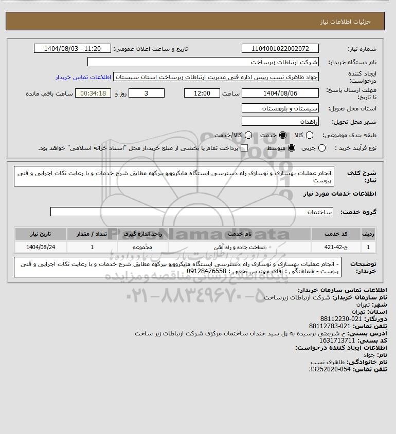 شرح کلی نیاز: انجام عملیات بهسازی و نوسازی راه دسترسی ایستگاه مایکروویو بیرکوه مطابق شرح خدمات و با رعایت نکات اجرایی و فنی پیوست
