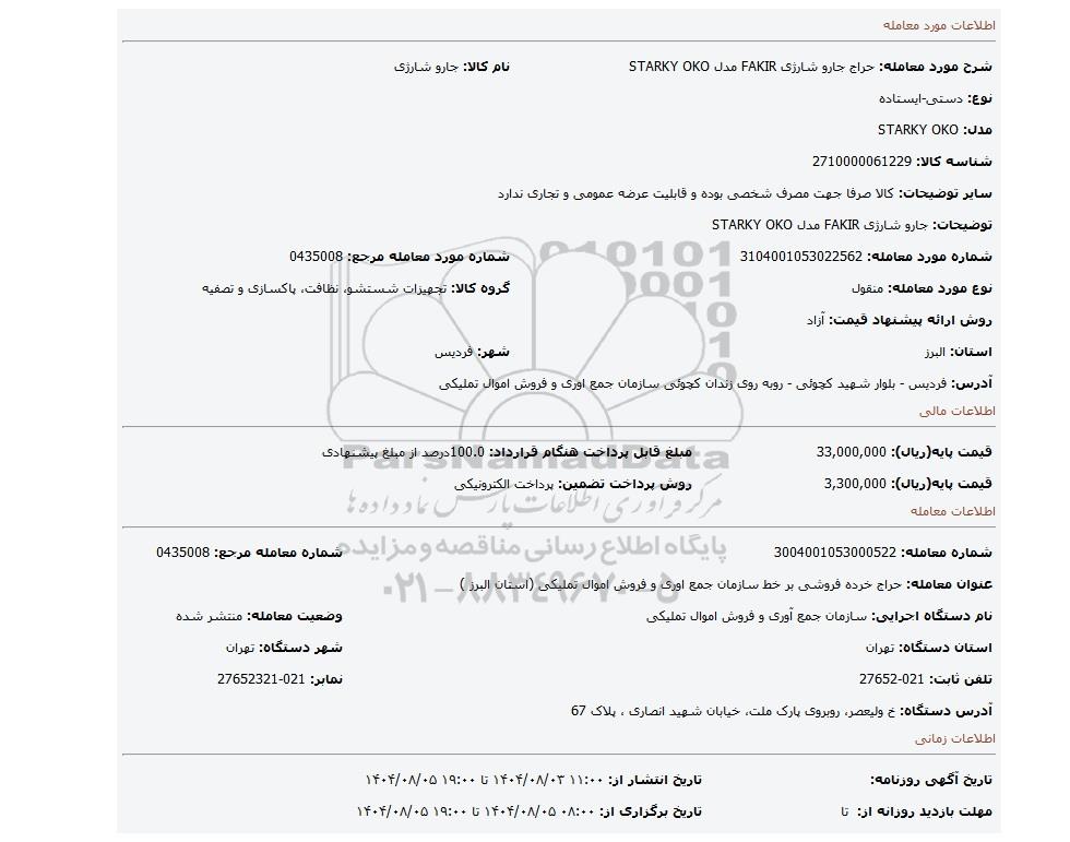 | عنوان معامله: حراج خرده فروشی بر خط سازمان جمع اوری و فروش اموال تملیکی (استان البرز ) | ||