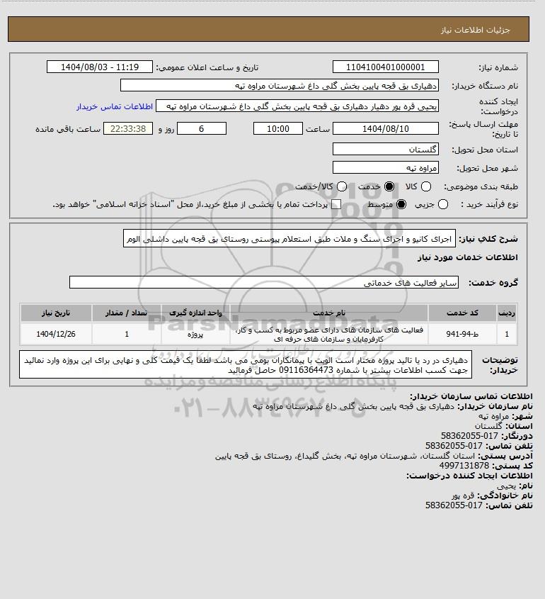 شرح کلی نیاز: اجرای کانیو و اجرای سنگ و ملات طبق استعلام پیوستی روستای بق قجه پایین داشلی الوم