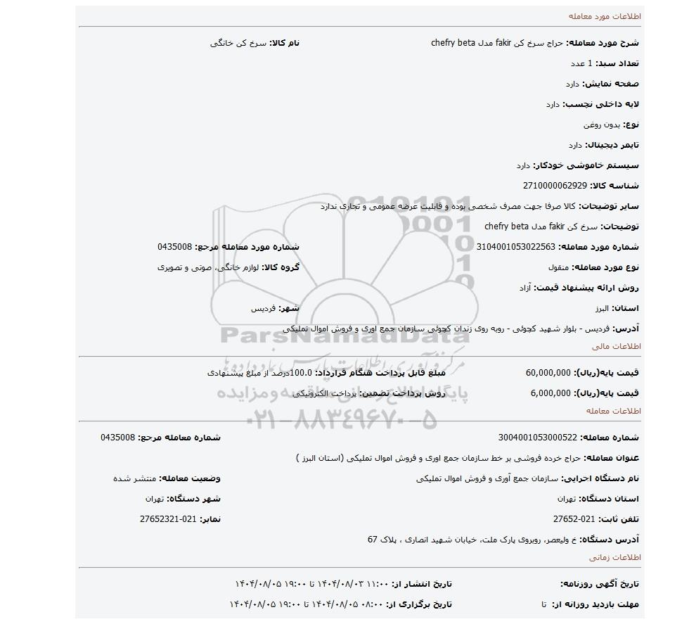 | عنوان معامله: حراج خرده فروشی بر خط سازمان جمع اوری و فروش اموال تملیکی (استان البرز ) | ||