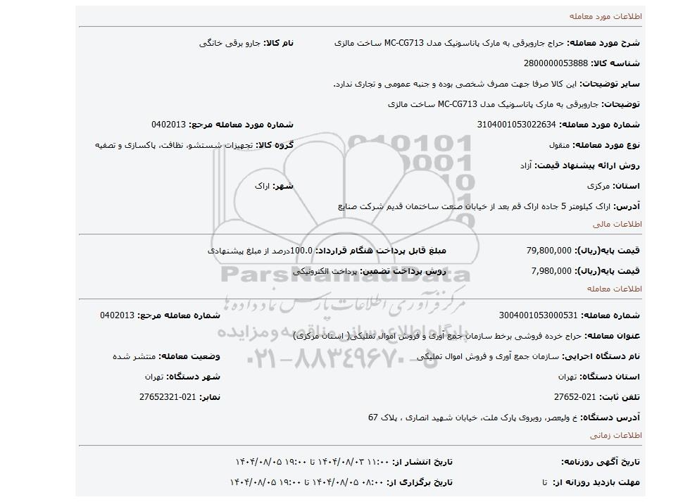 | عنوان معامله: حراج خرده فروشی برخط سازمان جمع آوری و فروش اموال تملیکی( استان مرکزی) | ||