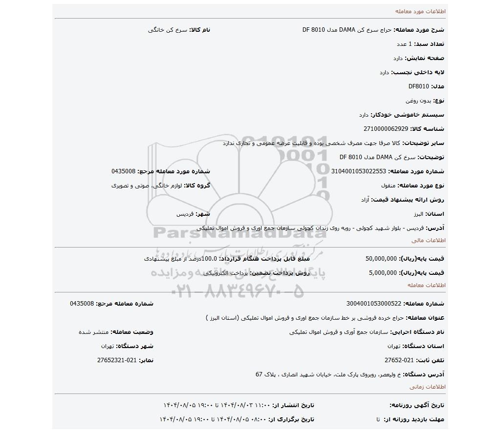 | شماره مورد معامله: 3104001053022553 | شماره مورد معامله مرجع: 0435008 | |
