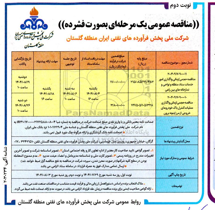 مناقصه حجمی /زمانی واگذاری امور خدمات ستاد منطقه ....- نوبت دوم از کلیه افراد متخصص و شرکتها واجد شرایط دعوت به عمل میآید در مناقصه با کد خبرگزاری پارس نماد: 9746826 شرکت نمایند.