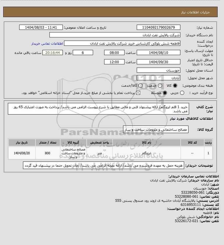 شرح کلی نیاز: خرید 1 قلم ایزوگام/ ارائه پیشنهاد فنی و مالی مطابق با شرح پیوست الزامی می باشد/ پرداخت به صورت اعتباری 45 روز می باشد