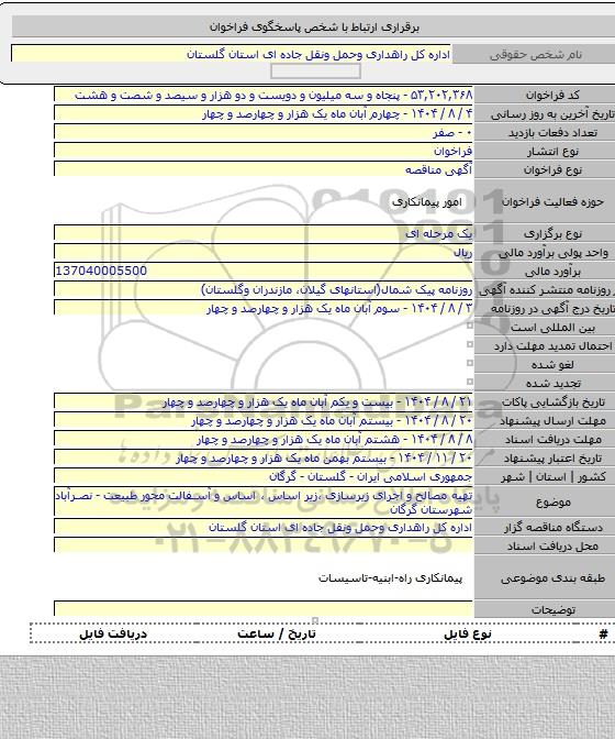 این مناقصه در تاریخ 1404/08/03 شروع و مهلت آن تا تاریخ 1404/08/08 میباشد.