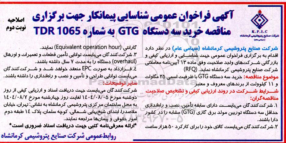 آگهی فراخوان عمومی شناسایی پیمانکار جهت برگزاری مناقصه خرید سه دستگاه GTG به شماره 1065 TDR