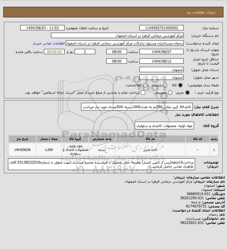 شرح کلی نیاز: کاغذA4 کپی مکس80گرم به تعداد1000بسته 500عددی مورد نیاز میباشد
