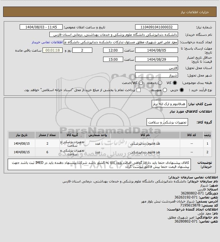 نام دستگاه خریدار:دانشکده دندانپزشکی دانشگاه علوم پزشکی و خدمات بهداشتی، درمانی استان فارس