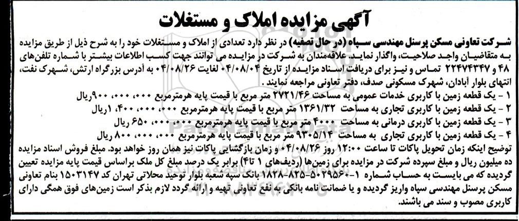 شرکت تعاونی مسکن پرسنل مهندسی سپاه (در حال تصفیه) در نظر دارد تعدادی از املاک و مستغلات خود را به شرح ذیل از طریق مزایده به متقاضیان واجد صلاحیت واگذار نماید. علاقه مندان به شرکت در مزایده میتوانند جهت کسب اطلاعات بیشتر با شماره تلفنهای 48 و 22474347 تماس و نیز برای دریافت اسناد مزایده از تاریخ 04.08.04 لغایت 04.08.26 به آدرس بزرگراه ارتش - شهرک نفت - انتهای بلوار آبادان - شهرک مسکونی صدف - دفتر تعاونی مراجعه نمایند .
