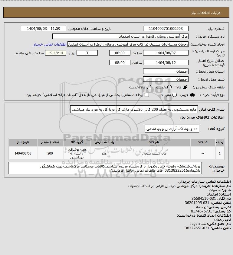 | 1 | -- | مایع دست شویی | عدد | مد و پوشاک، آرایشی و بهداشتی | 200 | 1404/08/08 |