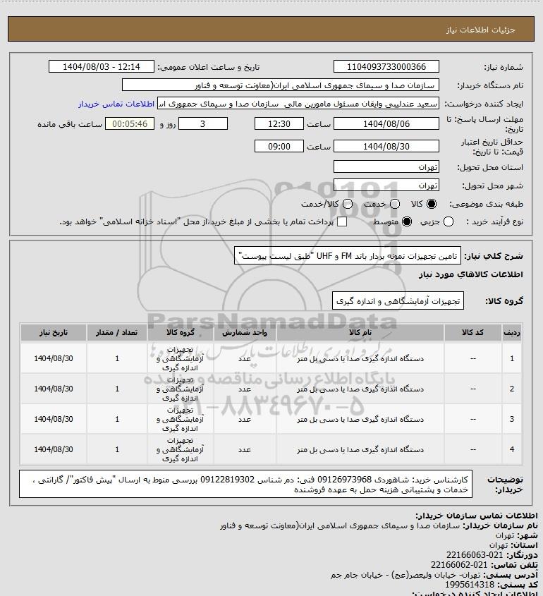 شرح کلی نیاز: تامین تجهیزات نمونه بردار باند FM و UHF "طبق لیست پیوست"