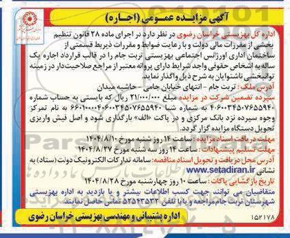 اداره کل بهزیستی خراسان رضوی در نظر دارد در اجرای ماده 28 قانون تنظیم بخشی از مقررات مالی دولت و با رعایت ضوابط و مقررات ذیربط قسمتی از ساختمان اداری اورژانس اجتماعی بهزیستی تربت جام را در قالب قرارداد اجاره یک ساله به اشخاص حقوقی واجد شرایط دارای پروانه معتبر از مراجع صلاحیت دار در زمینه توانبخشی ناشنوایان به شرح ذیل واگذار نماید.
