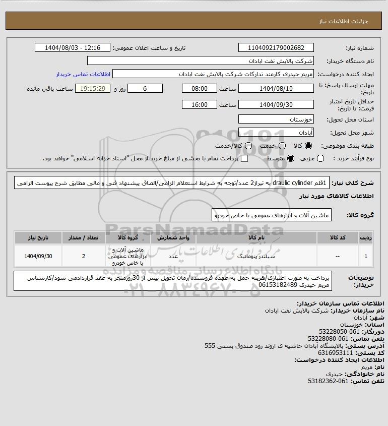 شرح کلی نیاز: 1قلم draulic cylinder به تیراژ2 عدد/توجه به شرایط استعلام الزامی/الصاق پیشنهاد فنی و مالی مطابق شرح پیوست الزامی