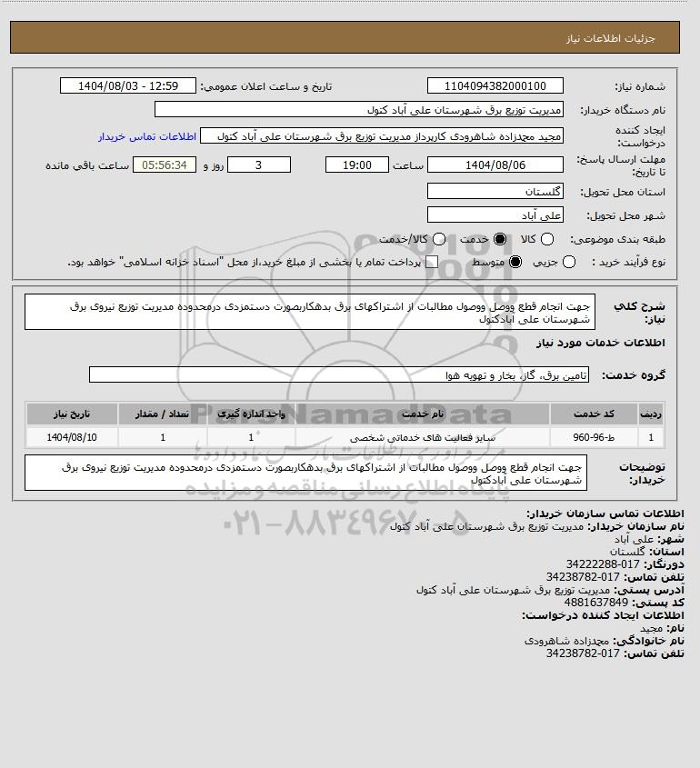 شرح کلی نیاز: جهت انجام قطع ووصل ووصول مطالبات از اشتراکهای برق بدهکاربصورت دستمزدی درمحدوده مدیریت توزیع نیروی برق شهرستان علی آبادکتول