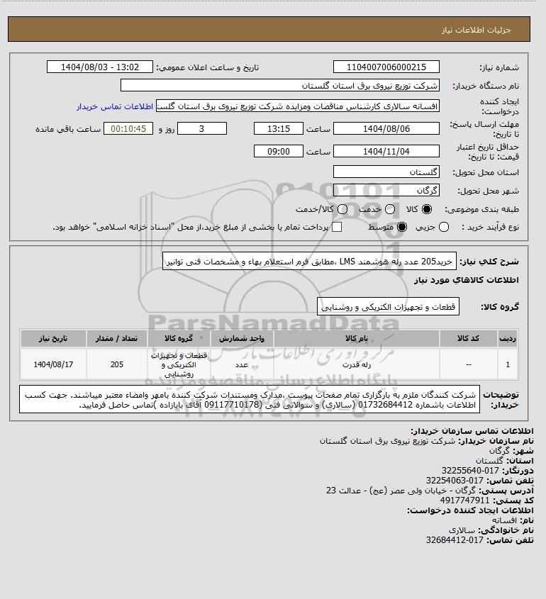 شرح کلی نیاز: خرید205 عدد رله هوشمند LMS ،مطابق فرم استعلام بهاء و مشخصات فنی توانیر