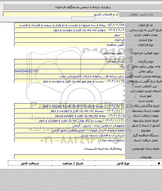 این مناقصه در استان اردبیل با دسته بندی های صنفی و تخصصی پیمانکاری آب و فاضلاب, پیمانکاری آب رتبه بالا 100 میلیارد ریال, مخازن برگزار میشود.