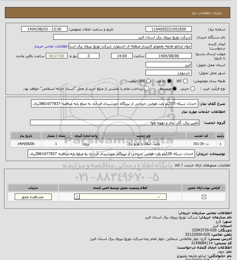 استعلام احداث شبکه 20کیلو ولت هوایی خروجی از نیروگاه خورشیدی فردآباد به مبلغ پایه مناقصه 3861677837ریال, استعلام احداث شبکه 20کیلو ولت هوایی خروجی از نیروگاه خورشیدی فردآباد به مبلغ پایه مناقصه 3861677837ریال