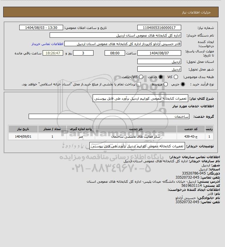 شرح کلی نیاز: تعمیرات کتابخانه عمومی کوراییم اردبیل