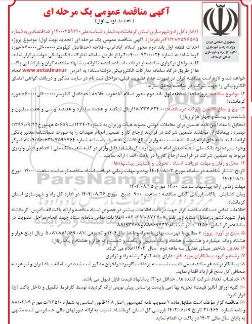 (1) اداره کل راه و شهرسازی استان کرمانشاه به شماره شناسه ملی 14000259220 و کد اقتصادی به شماره 411387576565 در نظر دارد آگهی مناقصه عمومی یک مرحله ای تجدید نوبت اول موضوع پروژه احداث قطعه اول باند دوم محور اسلام آباد - قلاجه - (حدفاصل کیلومتر 000+100 الی 000+06 (حوزه کرمانشاه) به شماره 2004000042000024 را از طریق سامانه تدارکات الکترونیکی دولت برگزار نماید. کلیه مراحل برگزاری مناقصه از دریافت اسناد مناقصه تا ارائه پیشنهاد مناقصه گران و بازگشایی پاکتها از طریق درگاه سامانه تدارکات الکترونیکی دولت (ستاد) ایران انجام خواهد شد و لازم است مناقصه گران در صورت عدم عضویت قبلی مراحل ثبت نام در سایت مذکور و دریافت گواهی امضای الکترونیکی را جهت شرکت در مناقصه محقق سازند.