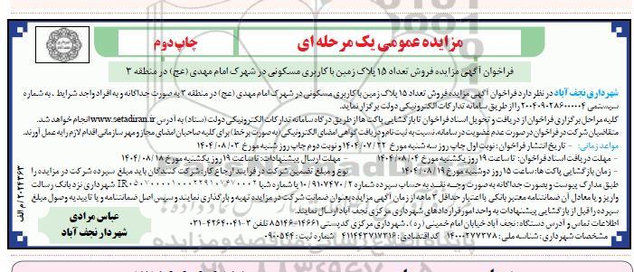 شهرداری نجف آباد در نظر دارد فراخوان آگهی مزایده فروش تعداد 10 پلاک زمین با کاربری مسکونی در شهرک امام مهدی (عج) در منطقه 3 به صورت جداگانه و به افراد واجد شرایط ، به شماره سیستمی 2004090286000004 را از طریق سامانه تدارکات الکترونیکی دولت برگزار نماید.