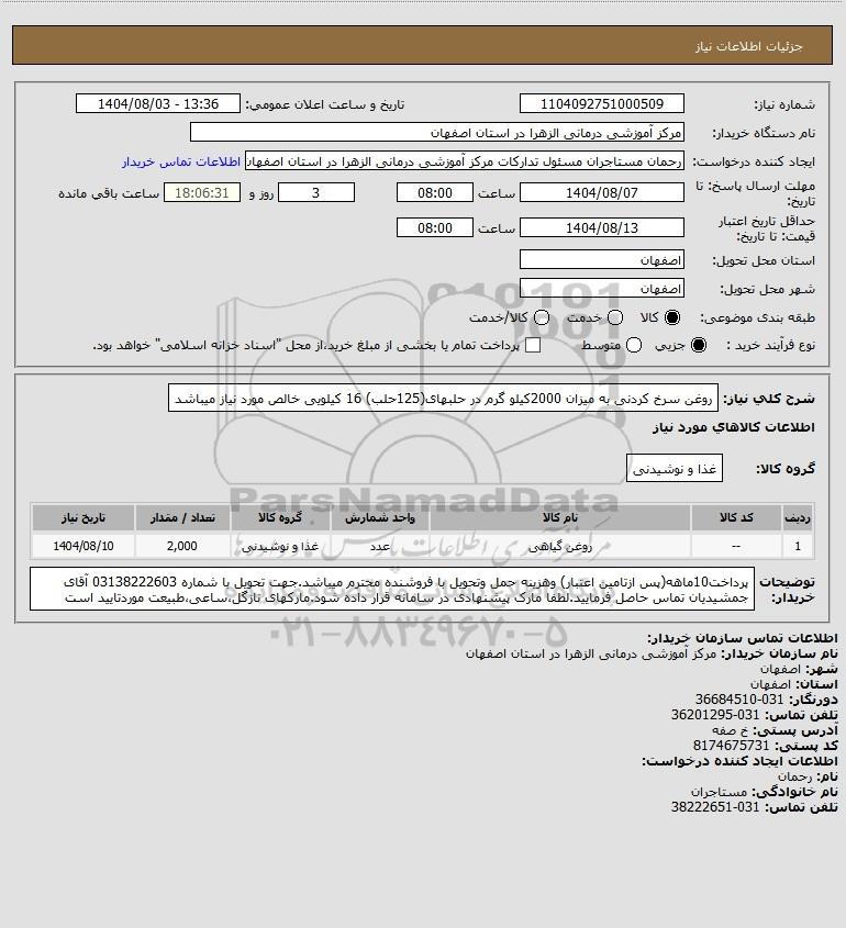 شرح کلی نیاز: روغن سرخ کردنی به میزان 2000کیلو گرم در حلبهای(125حلب) 16 کیلویی خالص مورد نیاز میباشد
