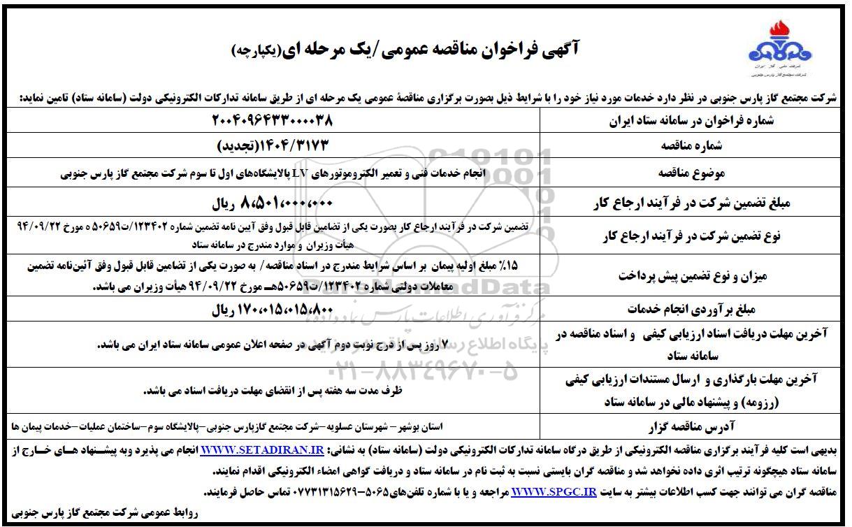 موضوع مناقصه: انجام خدمات فنی و تعمیر الکتروموتورهای LV پالایشگاه های اول تا سوم شرکت مجتمع گاز پارس جنوبی