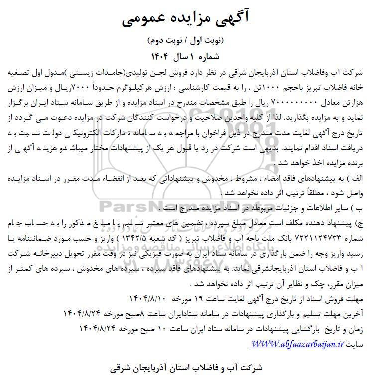 شرکت آب و فاضلاب استان آذربایجان شرقی در نظر دارد فروش لجن تولیدی (جامدات زیستی) مدول اول تصفیه خانه فاضلاب تبریز با حجم 1000 تن ، را به قیمت کارشناسی : ارزش هر کیلوگرم حدودا 7000 ریال و میزان ارزش هزارتن معادل 7000000000 ریال را طبق مشخصات مندرج در اسناد مزایده و از طریق سامانه ستاد ایران برگزار نماید و به مزایده بگذارید لذا از کلیه واجدین صلاحیت و درخواست کنندگان شرکت در مزایده دعوت می گردد از تاریخ درج آگهی لغایت مدت مندرج در ذیل فراخوان با مراجعه به سامانه تدارکات الکترونیکی دولت نسبت به دریافت اسناد اقدام نمایند. بدیهی است شرکت در رد یا قبول هر یک از پیشنهادات مختار میباشد و هزینه آگهی از برنده مزایده اخذ خواهد شد .