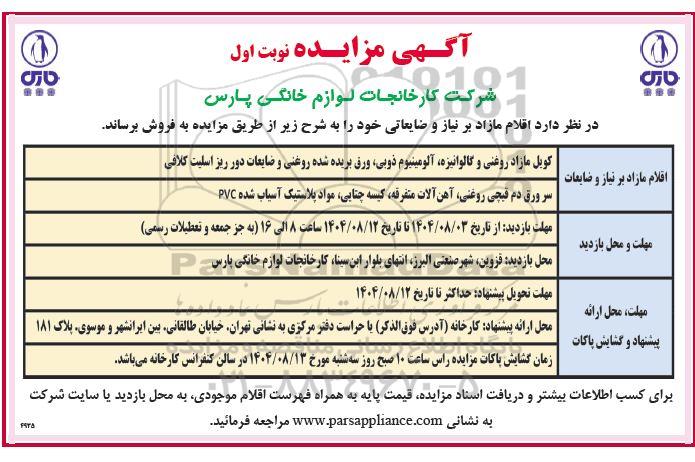 شرکت کارخانجات لوازم خانگی پارس در نظر دارد اقلام مازاد بر نیاز و ضایعاتی خود را به شرح زیر از طریق مزایده به فروش برساند.