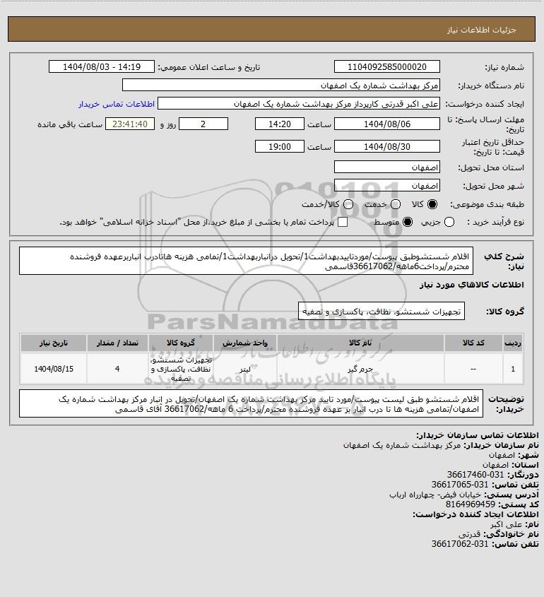 توضیحات خریدار:اقلام شستشو طبق لیست پیوست/مورد تایید مرکز بهداشت شماره یک اصفهان/تحویل در انبار مرکز بهداشت شماره یک اصفهان/تمامی هزینه ها تا درب انبار بر عهده فروشنده محترم/پرداخت 6 ماهه/36617062 آقای قاسمی