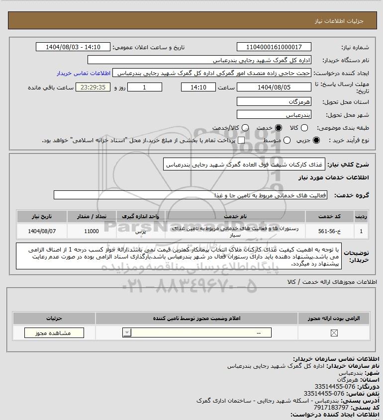 شرح کلی نیاز: غذای کارکنان شیفت فوق العاده گمرک شهید رجایی بندرعباس