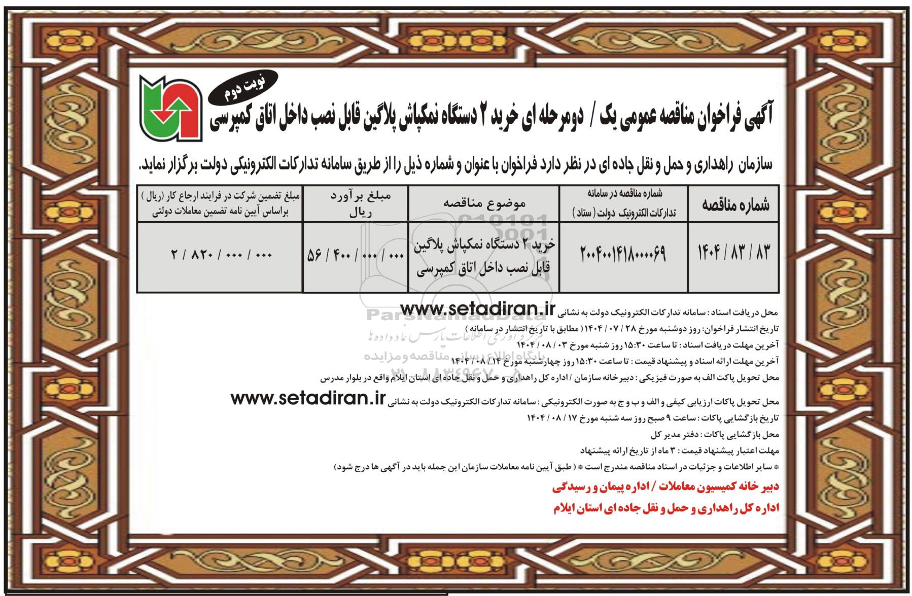 | 1404.83.83 | 2004001418000069 | خرید دو دستگاه نمکپاش پلاگین قابل نصب داخل کمپرسی | 56.400.000.000 | 2.820.000.000 |