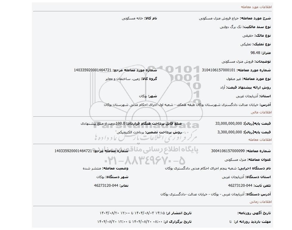 | شرح مورد معامله: حراج فروش منزل مسکونی | نام کالا: خانه مسکونی | |