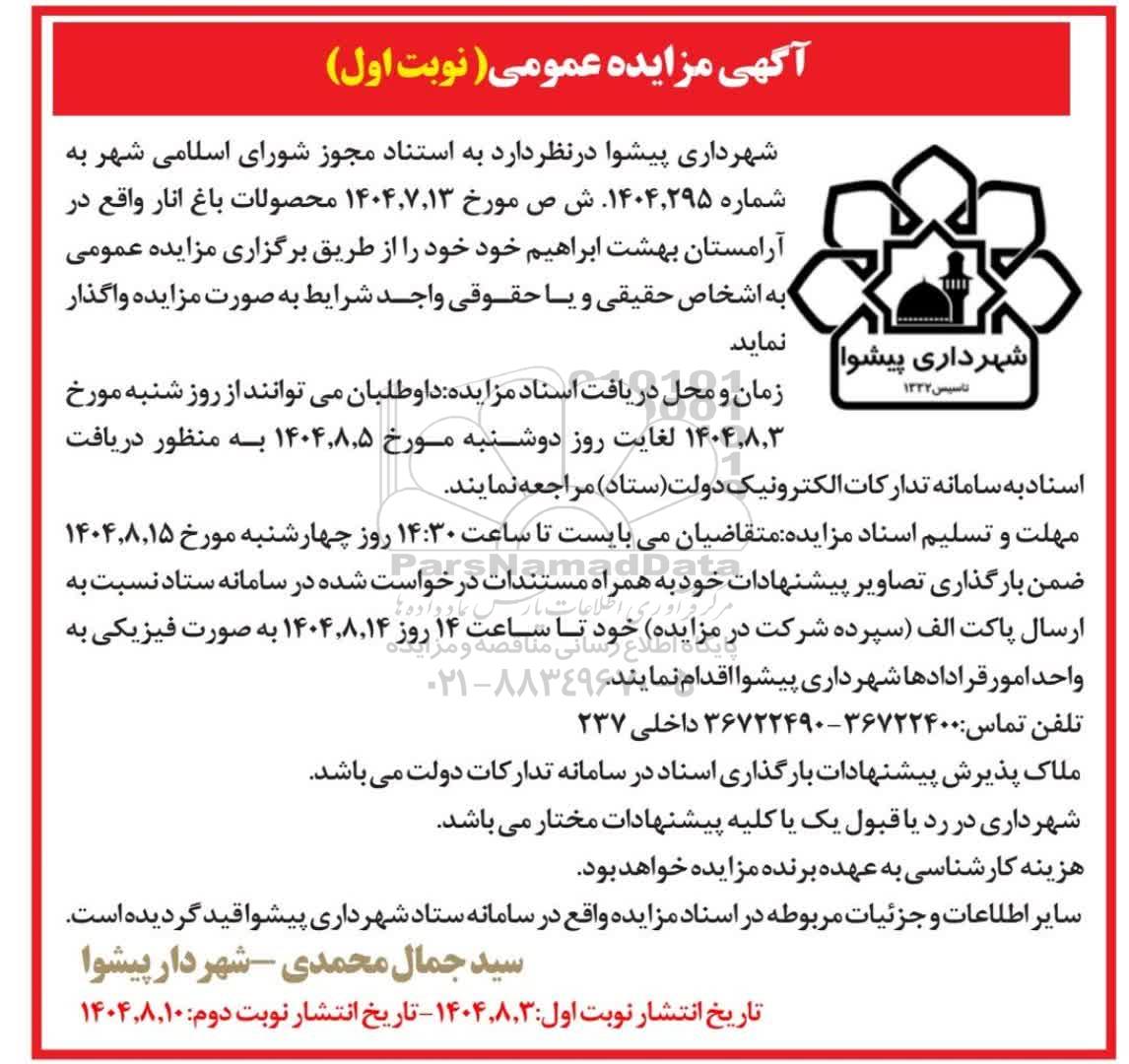 شهرداری پیشوا در نظر دارد به استناد مجوز شورای اسلامی شهر به شماره 1404.295 ش ص مورخ 1404.07.13 محصولات باغ انار واقع در آرامستان بهشت ابراهیم خود را از طریق برگزاری مزایده عمومی به اشخاص حقیقی و یا حقوقی واجد شرایط به صورت مزایده واگذار نماید.