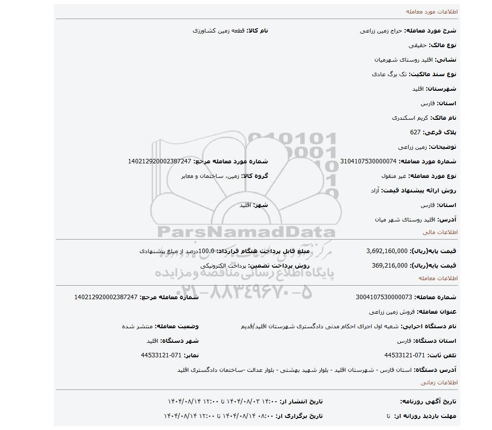 | شماره معامله: 3004107530000073 | شماره معامله مرجع: 140212920002387247 | |