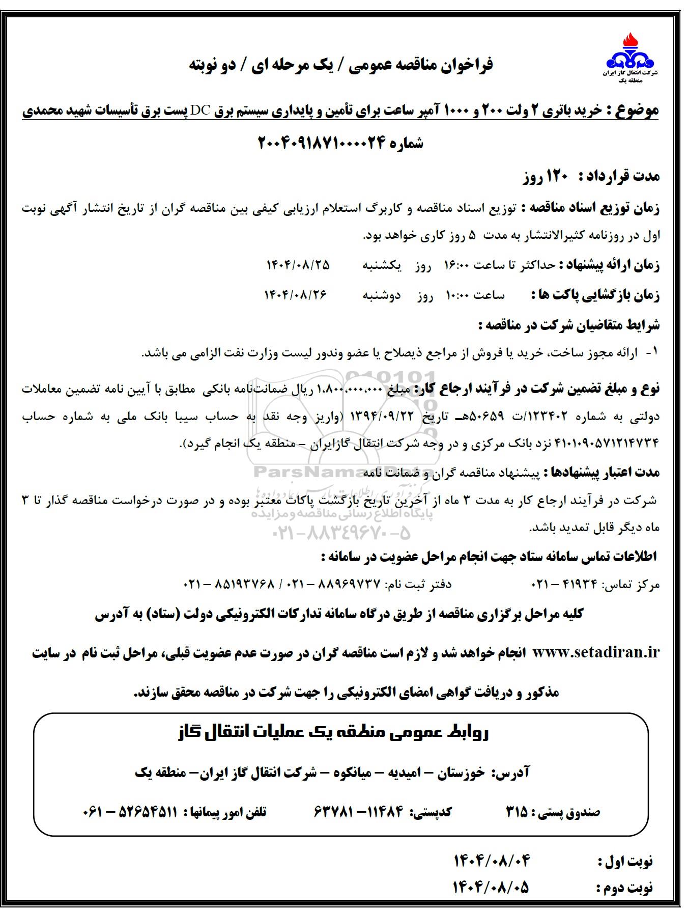 مناقصه خرید باتری 2 ولت 200 و 1000 آمپر ساعت برای تامین و پایداری سیستم برق DC پست برق از کلیه افراد متخصص و شرکتها واجد شرایط دعوت به عمل میآید در مناقصه با کد خبرگزاری پارس نماد: 9748751 شرکت نمایند.