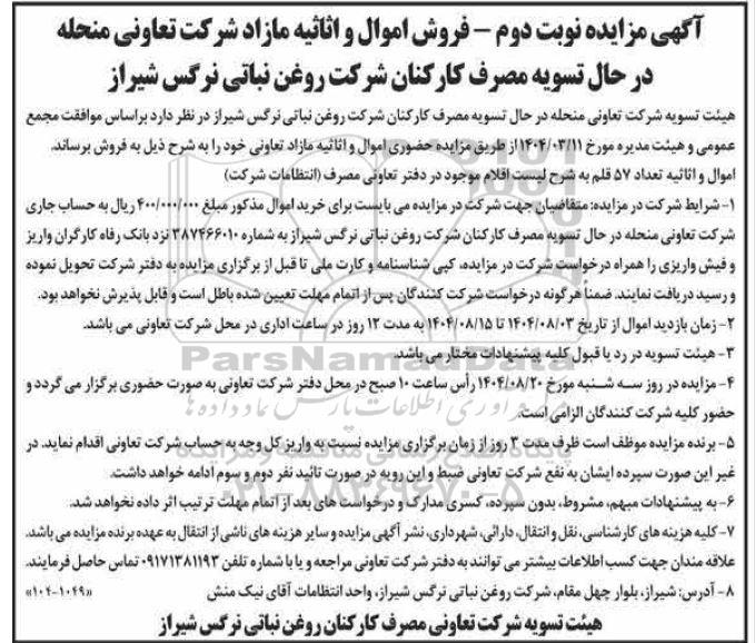 آگهی مزایده نوبت دوم - فروش اموال و اثاثیه مازاد شرکت تعاونی منحله در حال تسویه مصرف کارکنان شرکت روغن نباتی نرگس شیراز