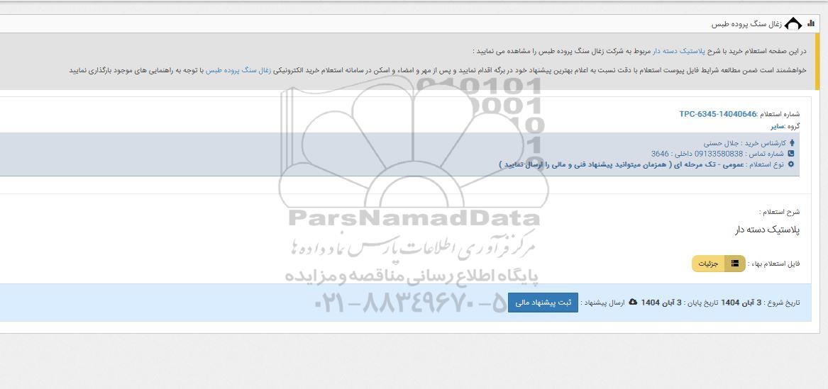 در این صفحه استعلام خرید با شرح پلاستیک دسته دار مربوط به شرکت زغال سنگ پروده طبس را مشاهده می نمایید: