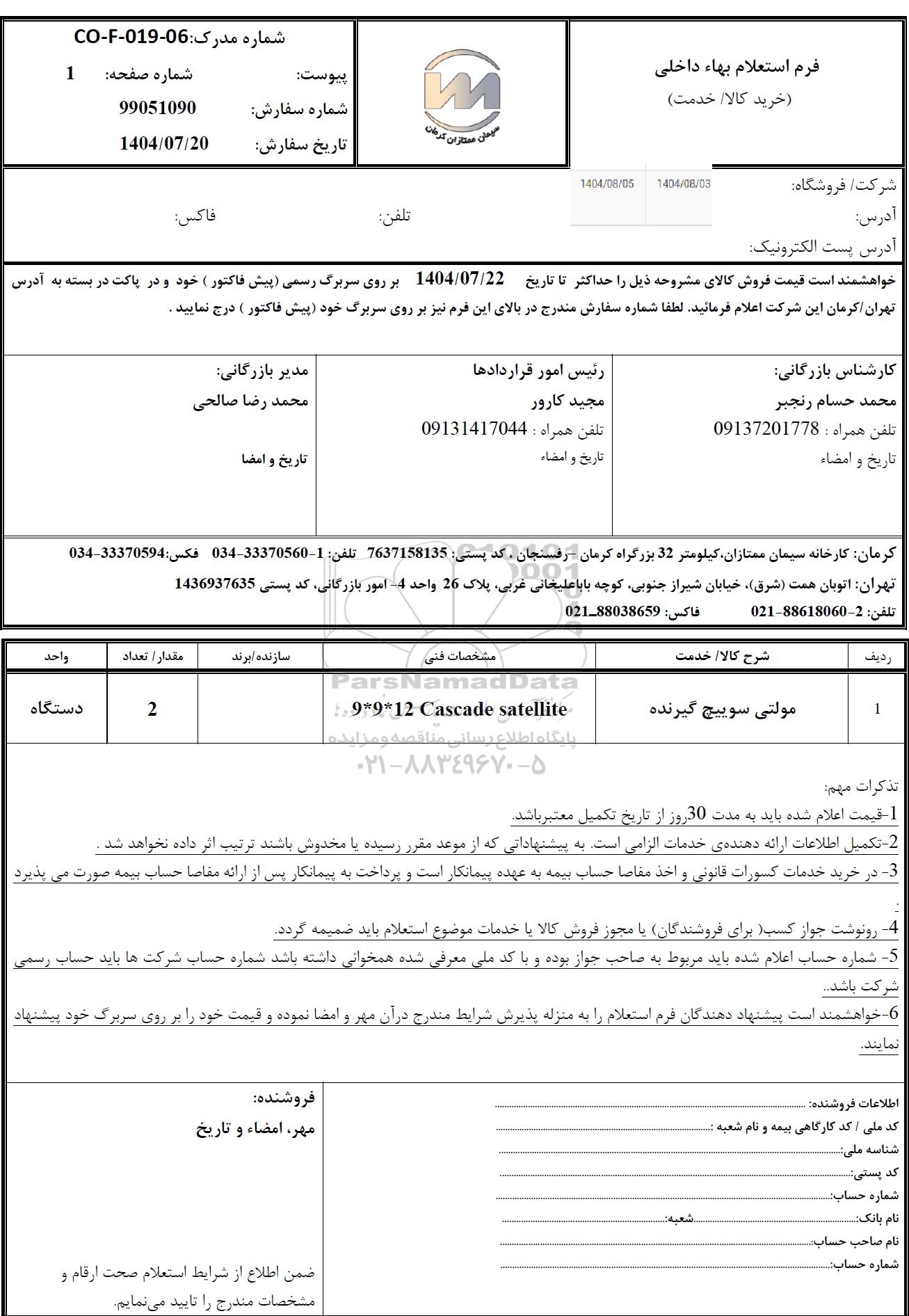 خواهشمند است قیمت فروش کالای مشروحه ذیل را حداکثر تا تاریخ 1404.07.22 بر روی سربرگ رسمی (پیش فاکتور) خود و در پاکت دربسته به ادرس تهران /کرمان این شرکت اعلام فرمائید. لطفا شماره سفارش مندرج در بالای این فرم نیز بر روی سربرگ خود (پیش فاکتور) درج نمایید