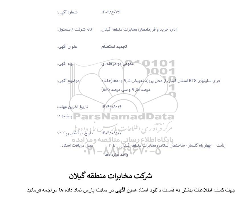 موضوع آگهی: اجرای سایتهای BTS استان گیلان از محل پروژه فاز 9 و USO (هفتاد درصد فاز 9 و 30 درصد USO)