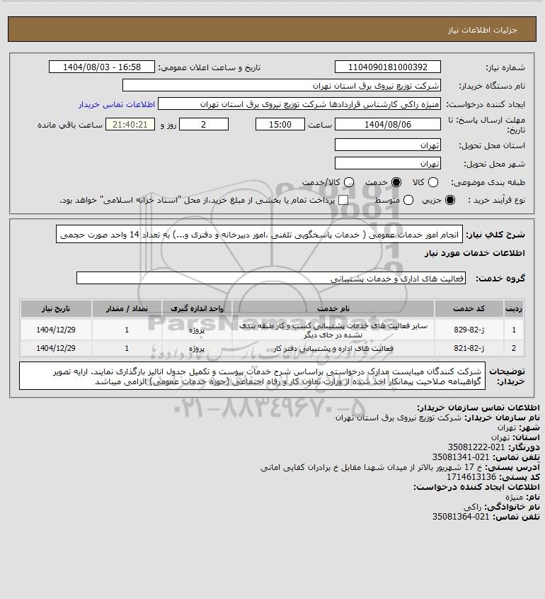 شرح کلی نیاز: انجام امور خدمات عمومی ( خدمات پاسخگویی تلفنی ،امور دبیرخانه و دفتری و...) به تعداد 14 واحد صورت حجمی